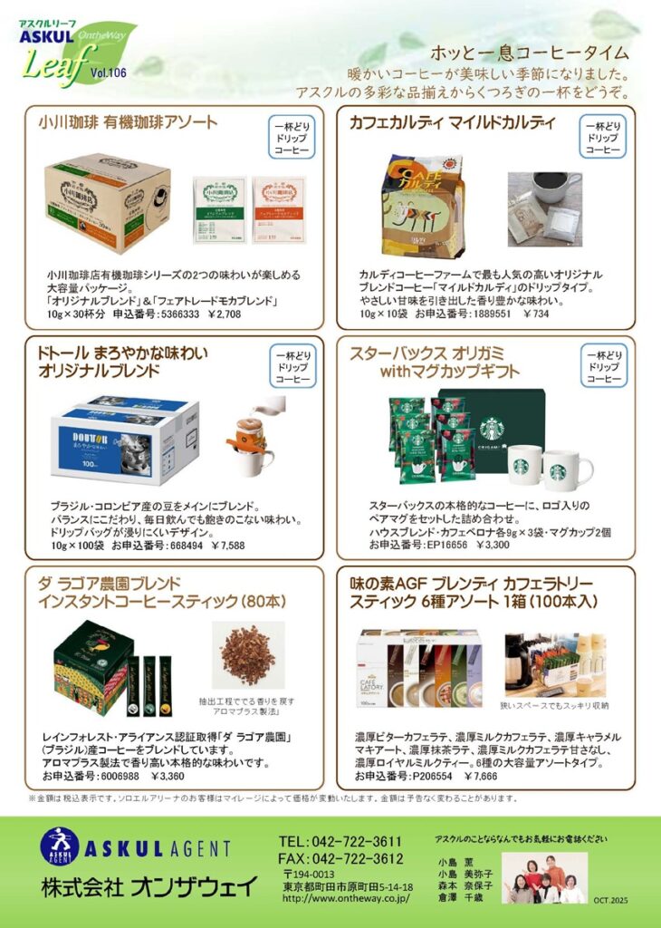ホッと一息コーヒータイム暖かいコーヒーが美味しい季節になりました。アスクルの多彩な品揃えからくつろぎの一杯をどうぞ。 -
