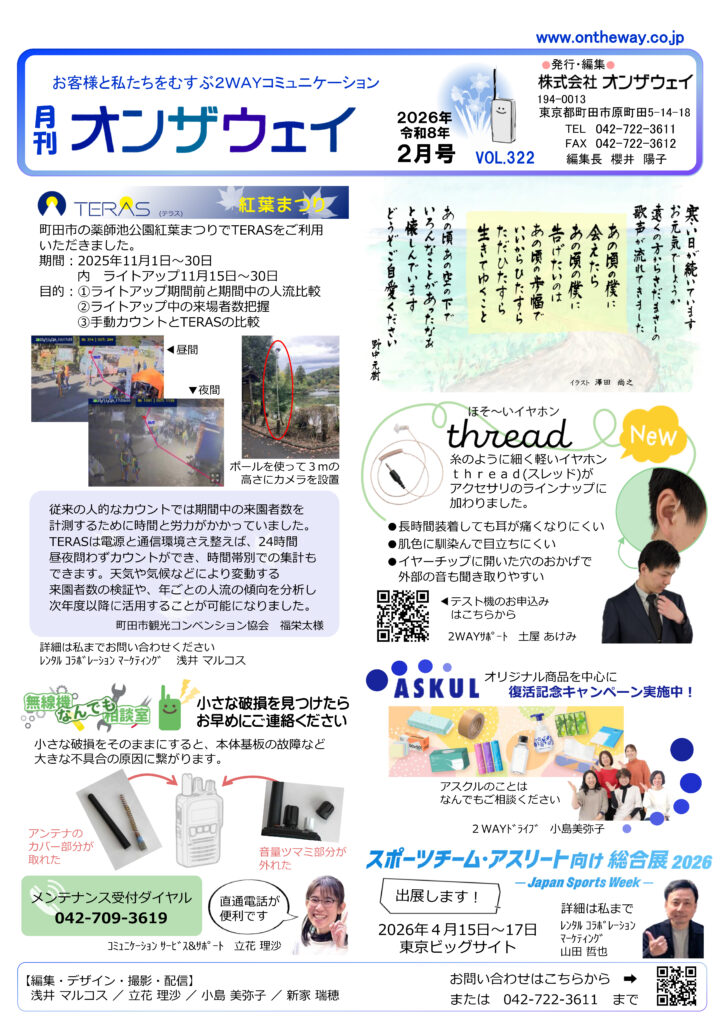 月刊オンザウェイ10月号 Vol.318をお届けします。今月号は、現場での無線機やAIカメラTERASの活用についてご紹介しています。ご不明な点があればお気軽にお問い合わせください。また、無線局の免許状や登録状のデジタル化についてもご案内がございます。...